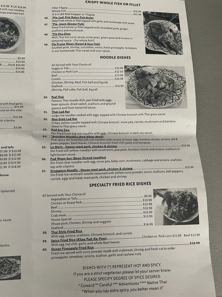Flavored with red chili paste with a loouch of yellow curry powder then tossed with pineapple, onions, tomatoes and summer squash in coconut milk. Spicy.